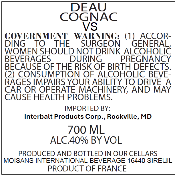 Deau VS Cognac is produced and bottled by Moisans International Beverage in Sireuil, France.