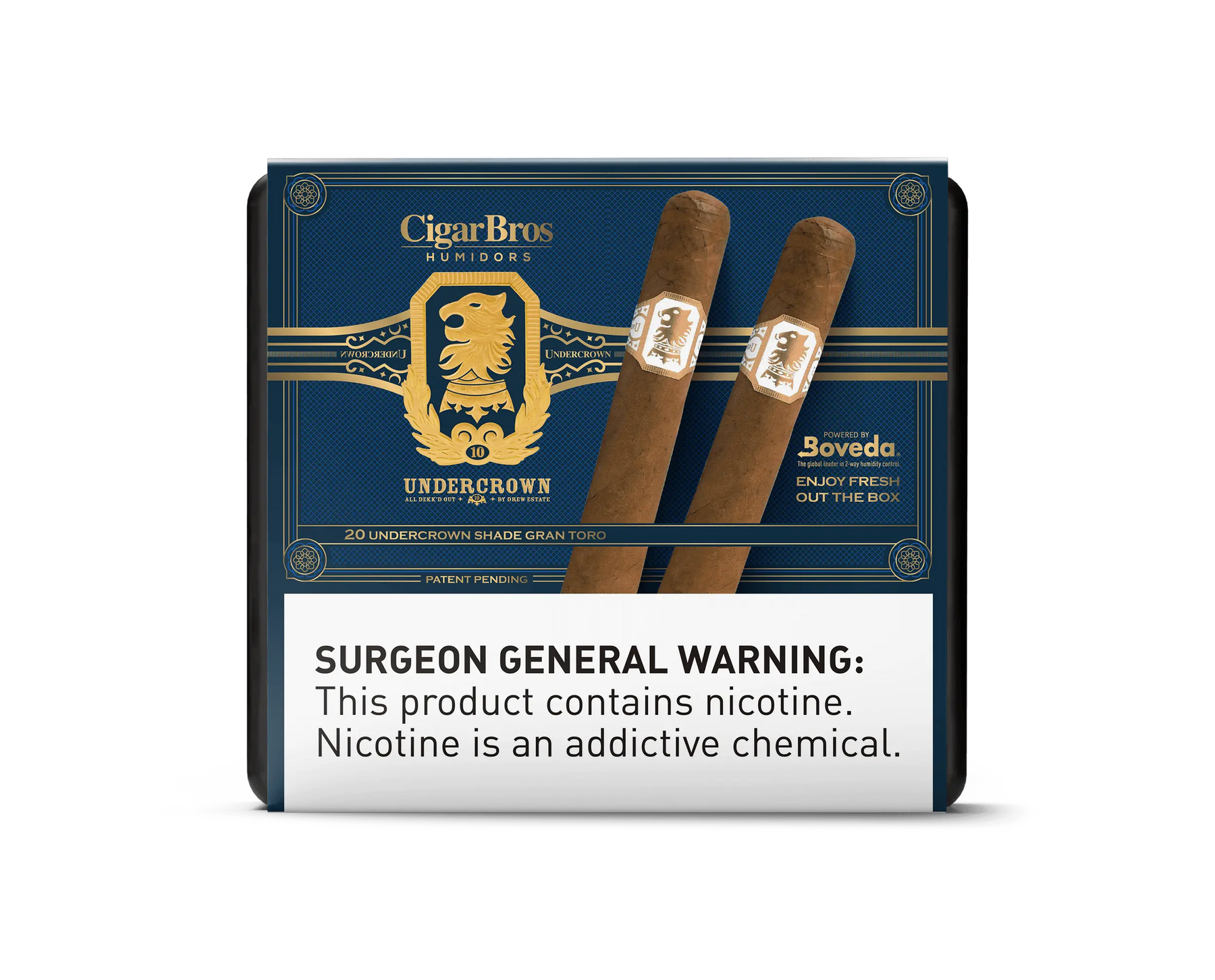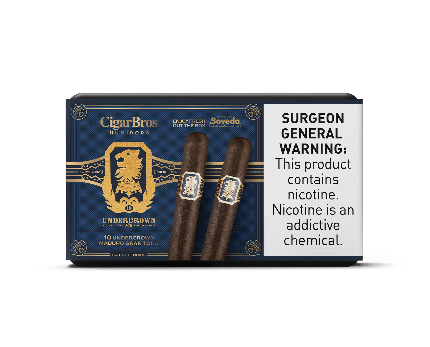 Featuring a gold lion crest, the number 10, and laurel leaves above UNDERCROWN in bold gold letters, this CigarBros UnderCrown by CigarBros cigar is ideal for your humidor. ALL DEKK’D OUT and BY DREW ESTATE appear in smaller gold text.