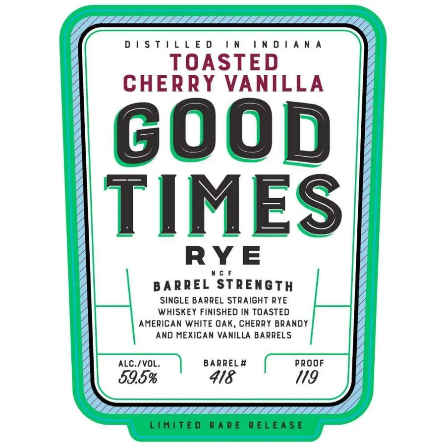 Good Times Toasted Cherry Vanilla Rye is a barrel-strength, single-barrel straight rye whiskey finished in toasted American white oak, cherry brandy, and Mexican vanilla barrels. Non-chill filtered and straight from the barrel, therefore char may be present. Bottled by Whiskey Thief Distilling Co.