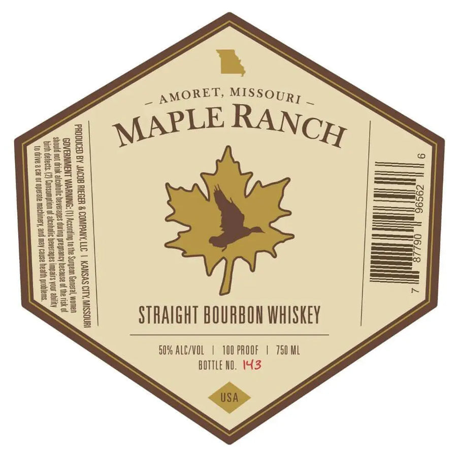 Maple Ranch Straight Bourbon Whiskey is bottled at 50% ALC/VOL (100 Proof). Produced by Jacob Rieger & Company.