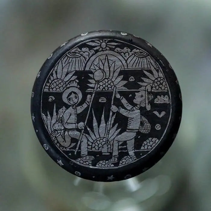 A: Amate is a traditional Mexican folk art style that dates back to the 1950s, often painted on bark paper. Here, it’s reimagined on the bottle stoppers to narrate the agave plant’s story.