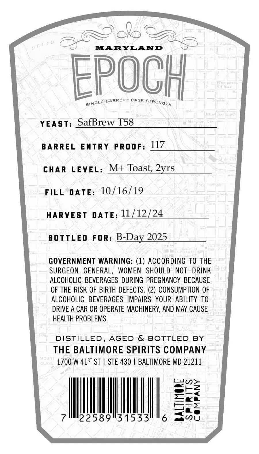 Experience a true expression of Maryland's historic distilling heritage with Maryland Epoch Straight Rye Whiskey. This single barrel, cask strength whiskey is pot-distilled from 100% rye, embracing the traditional methods that made rye whiskey famous. Bottled at 58.5% ABV (117 proof), Epoch presents bold, complex flavors and an authentic taste of Maryland craftsmanship. Aged for over five years, this release offers a robust drinking experience that showcases the meticulous care and artistry of The Baltimore Spirits Company. Perfect for collectors and connoisseurs seeking a unique and memorable dram.