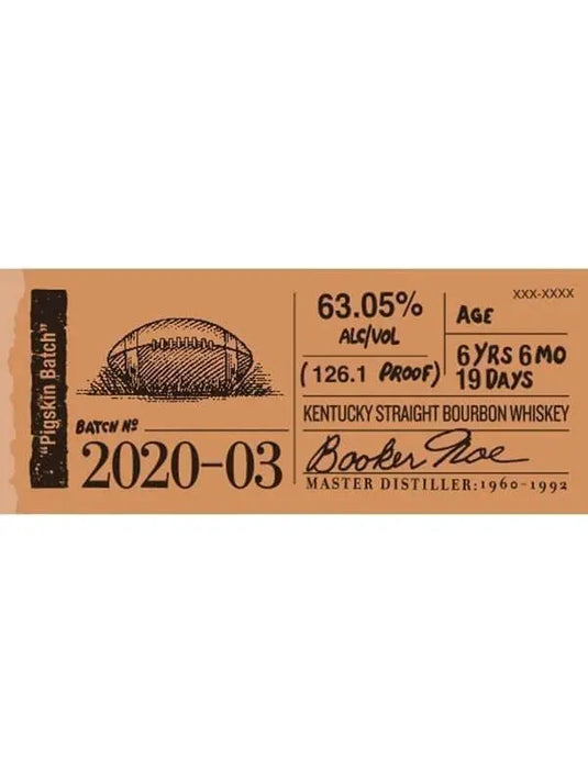 Booker’s "Pigskin Batch" Batch 2020-03 is aged for 6 years, 6 months, and 19 days and bottled at 126.1 Proof.