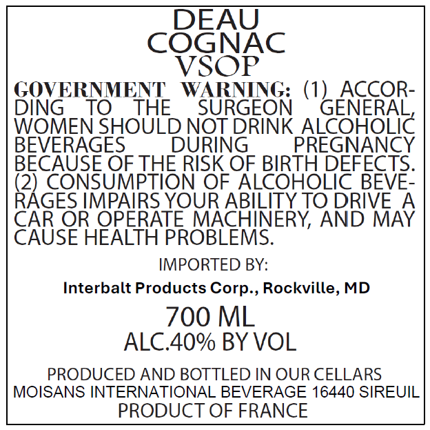 Deau VSOP is produced in the Cognac region of France by Moisans International Beverage in Sireuil. -